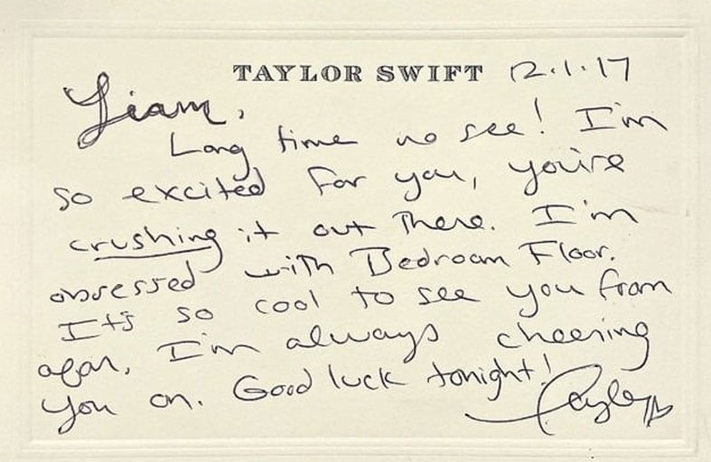 وتعود الرسالة إلى عام 2017، عندما وجّهت سويفت كلمات دعم لباين قبل مشاركتهما في حفل Capital FM Jingle Bell Ball الذي استضافه مجمّع O2 Arena بالعاصمة البريطانية لندن، وفقاً لـtribune.