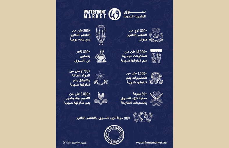 يبلغ حجم التداول اليومي في “سوق الواجهة البحرية” بدبي أكثر من 800 طنٍ من الأغذية الطازجة خاصة المنتجات البحرية، مما يؤكد أهميته بوصفه مركزا رئيسيا لتجارة الجملة والتجزئة،يجمع تحت مظلته 800 تاجر.