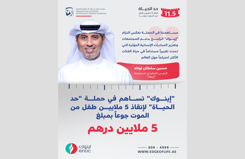أعلنت مجموعة "إينوك" الشركة العالمية الرائدة والمتكاملة في مجال الطاقة، عن تبرعها بمبلغ 5 ملايين درهم في للمساهمة في تحقيق مستهدفات الحملة الرمضانية "حد الحياة" لإنقاذ 5 ملايين طفل من الموت جوعاً، والتي أطلقها صاحب السمو الشيخ محمد بن راشد آل مكتوم نائب رئيس الدولة، رئيس مجلس الوزراء حاكم دبي "رعاه الله"، بالتزامن مع شهر رمضان الكريم، لتوفير مليار درهم على الأقل يتم استثمارها في مكافحة جوع الأطفال في العالم.