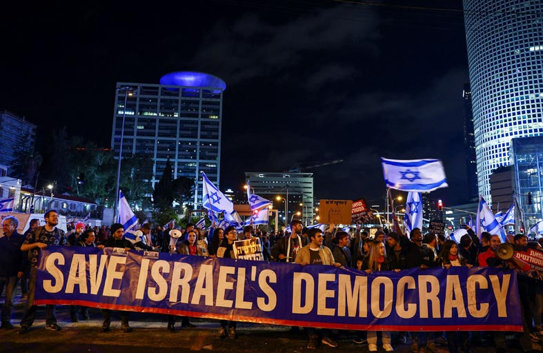 تعيش إسرائيل حالة من الفوضى السياسية في ظل احتجاجات متواصلة ضد خطة رئيس الحكومة الخاصة بالإصلاحات القضائية. وشهدت تل أبيب أمس الأول الخميس، احتجاجات عارمة، أغلق خلالها متظاهرون الطرق المؤدية لمطار بن غوريون، وميناء حيفا، ومراكز حيوية أخرى في القدس.