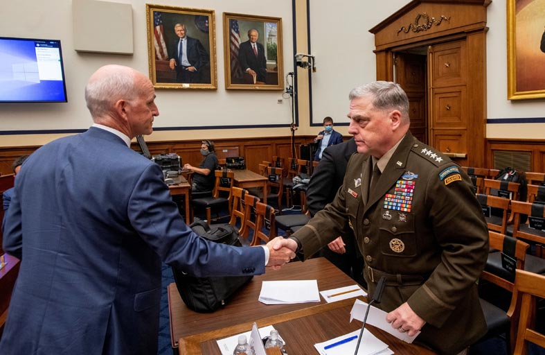 قبل ساعات من تصريح ساكي عن الرقابة التشريعية، قال رئيس هيئة الأركان الجنرال مارك ميلي ورئيس القيادة المركزية الجنرال فرنك ماكنزي للجنة الخدمات المسلحة في مجلس الشيوخ، إنهما أصدرا توصية بإبقاء 2500 جندي في أفغانستان لمنع البلاد من الانهيار.
