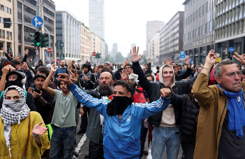 نظمت أمس تظاهرات وإضرابات في مدن إيطالية عدة تلبية لدعوة النقابات إلى التعبئة «للتنديد بالإبادة الجماعية في غزة» والمطالبة بفرض عقوبات اقتصادية ودبلوماسية على إسرائيل.