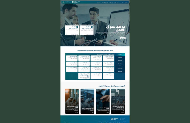 ويتضمن الموقع العديد من الواجهات منها، واقع تنـــــــافسية سوق العمل الإماراتي ضمن مؤشرات التنافسية العالمية، وبيانات وإحصائيات حول القوى العاملة في الدولة والمنشآت والتوطين إلى جانب البيانات المتعلقة بمنظومة الحماية الاجتماعية والرفاه والتي تضمن نظام التأمين ضد التعطل عن العمل ونظام الادخار وسياسة حماية العمال من الإجهاد الحراري والتأمين الصـــــــحي وبرنامج حـــــــــماية مســــــتحقات العمال ونظام حماية الأجور، إضافة إلى إحصائيات ومعلومات حول منظومة الرقابة والتفتيش وغيرها من الواجهات.