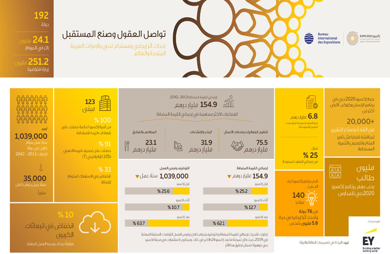 توقع تقرير لشركة "إرنست ويونغ" (EY) أن تبلغ إجمالي القيمة التي يضيفها إكسبو 2020 دبي وإرثه لاقتصاد دولة الإمارات العربية المتحدة حوالي 154.9 مليار درهم (42.2 مليار دولار أمريكي) وذلك في الفترة من 2013 (تاريخ الفوز بتنظيم إكسبو) إلى 2042 وأن يدعم توفير فرص عمل تقدر بما يقرب من 1,039,000 من سنوات العمل بدوام كامل، أي ما يعادل أكثر من 35,600 وظيفة بدوام كامل سنويًا في دولة الإمارات خلال الفترة ذاتها.