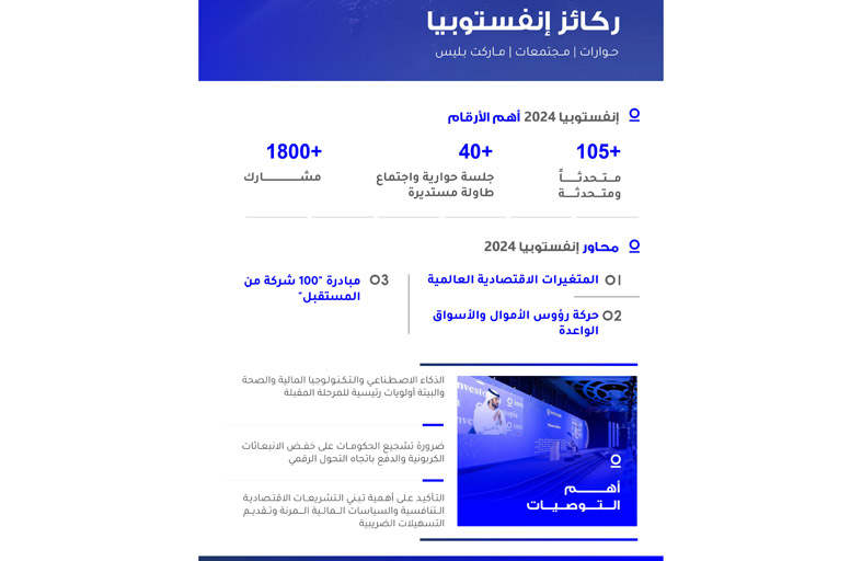 نجحت "إنفستوبيا 2024"، في إطلاق وصناعة حوار استراتيجي شامل جمع أكثر من105 متحدثين ومتحدثات من الوزراء وصناع القرار وكبار المستثمرين والخبراء الاقتصاديين ورواد الأعمال من مختلف أنحـــــــاء العالـــــم تحت مظلة واحدة، لرســـــــــم مسـار واضح يدعم النمو الاقتصادي المســتدام للدول والمجتمعات، وتعزيز المسـيرة التنموية في ظل التحديات الاقتصادية التي يشهدها العالم، والتباحث حول أبرز الملفـــــات الاقتصاديــــــة الحيوية على المســــــــتوى الإقليمي والعالمي.