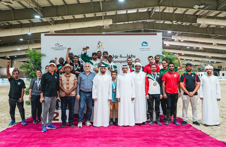 وتوج الفائزين، راشد المزروعي رئيس قسم التقاط الأوتاد بالاتحاد، ومحمد حاتم الجنيبي، مدير الفعاليات بأكاديمية بوذيب للفروسية.