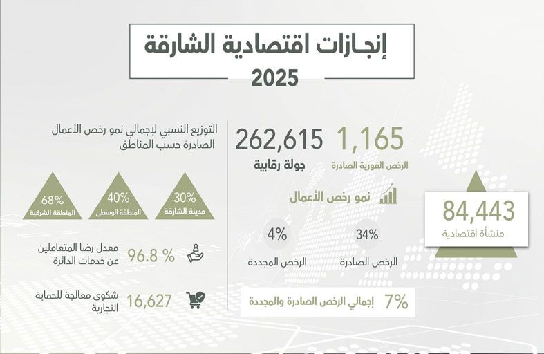 وأوضح أن رخص الأعمال الصادرة حققت ارتفاعاً ملحوظاً في معدلات النمو وقد تصدرت رخص اعتماد (المنزلية) بنسبة نمو 57% تلتها رخص المتاجرة الإلكترونية بنسبة 50% ثم الرخص المهنية بنسبة 42% فيما سجلت الرخص التجارية نمواً بنسبة 30% والصناعية بنسبة 17% وهو ما يؤكد تنوع القاعدة الاقتصادية وتعدد الفرص الاستثمارية في الإمارة.