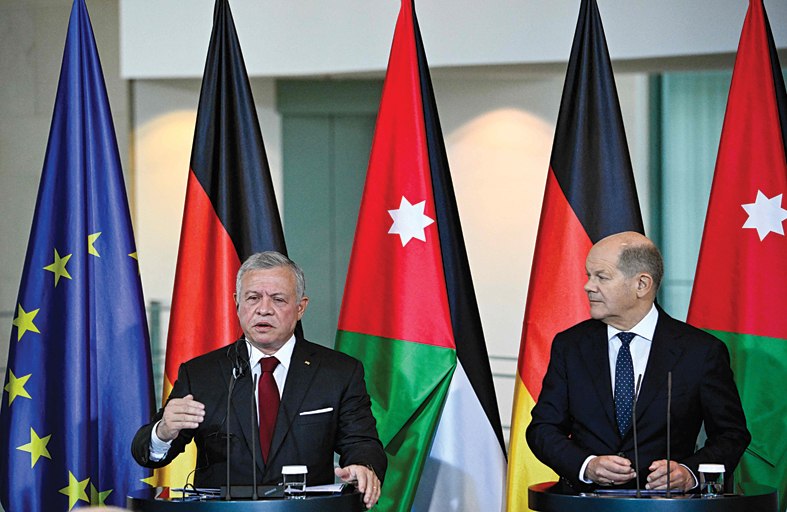 حذر العاهل الأردني الملك عبد الله الثاني الثلاثاء من وضع خطير جدا في منطقة الشرق الأوسط إذا توسعت الحرب بين إسرائيل وحركة (حماس) إلى دول أخرى. وقال الملك بعد لقائه المستشار الألماني أولاف شولتس وخلال مؤتمر صحفي مشترك في برلين «المنطقة برمتها على شفا السقوط في الهاوية التي تدفعنا إليها هذه الدوامة الجديدة من الموت والدمار».