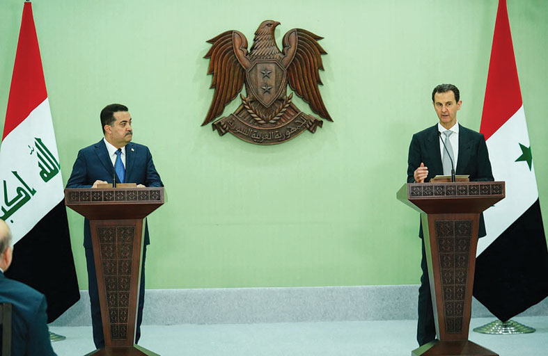 وصف الرئيس السوري بشار الأسد العلاقات مع العراق بالمتينة والتاريخية، مشيدا بوقوف الشعب العراقي وقيادته إلى جانب سوريا في أصعب الفترات. وتحدث الأسد خلال مؤتمر صحفي جمعه برئيس الوزراء العراقي محمد شياع السوداني، أمس، خلال زيارة الأخير لدمشق.
