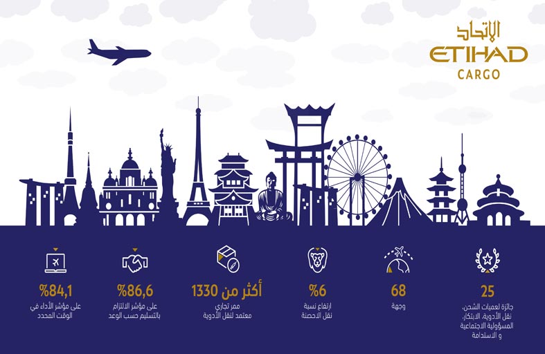 وفي إطار مساعيها لتعزيز الربط بين أبوظبي وبقية أنحاء العالم، طورت الاتحاد للشحن أكثر من 1,330 ممرا تجاريا حاصل اعلى اعتمادي نقل المنتجات الصيدلانية وممارسات التوزيع الجيد، لضمان سلامة المنتجات خلال عملية النقل.