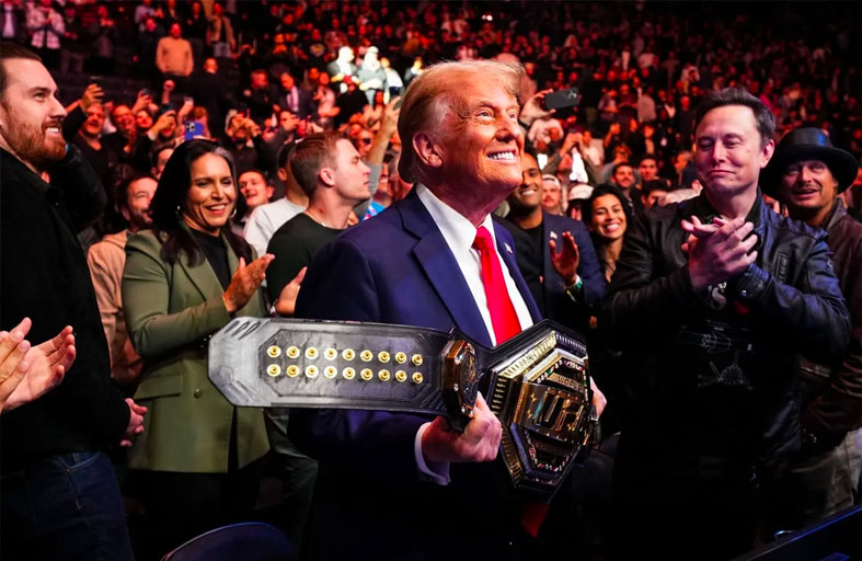 ويُعد ترامب من الضيوف الدائمين لنزالات الفنون القتالية الدامية، حيث يتبادل المقاتلون اللكمات والركلات والاشتباك الجسدي في معركة بلا قيود تنتهي بالاستسلام أو بالضربة القاضية.