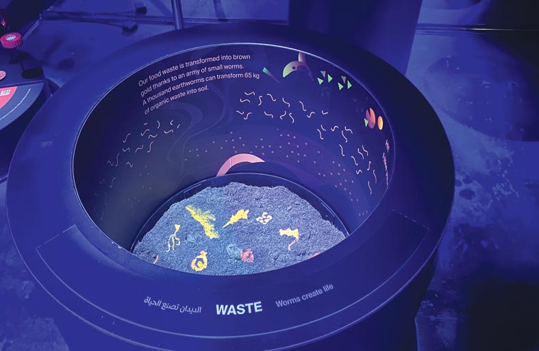 وتجدر الإشارة إلى أن معرض "لا وقت للهدر" يركز أيضاً على تحويل مواد نفايات مختلفة إلى منتجات ذات جودة أفضل وفائدة أكبر. فعلى سبيل المثال، يستعرض الجناح كيف يُعاد تدوير البلاستيك إلى مواد خاصة بالأزياء، واستخلاص الذهب من هواتف ذكية مستعملة، وقدرة الديدان على تحويل المواد العضوية إلى سماد.
