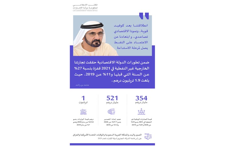 - التجارة الخارجية غير النفطية لدولة الإمارات تقترب من 1.9 تريليون درهم في 2021 وتحقق 27 % نموا عن 2020 و11 % عن 2019