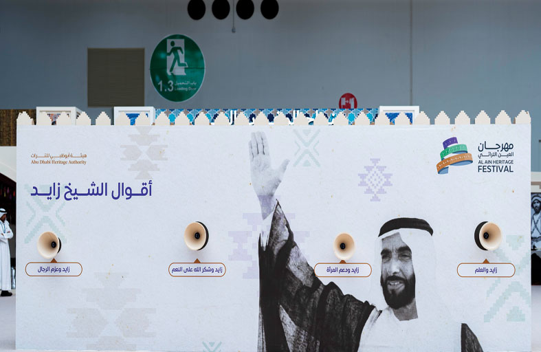 يتزين أحد الجدران في ساحة مهرجان العين التراثي بصور المغفور له الشيخ زايد بن سلطان آل نهيان، طيّب الله ثراه، بابتسامته المعهودة التي تجمع الهيبة والود، لتمثل بوابة لزوار المهرجان الذي انطلق "السبت" ويستمر حتى 9 فبراير بأرض المعارض في مدينة العين، يعبرون منها لرحلة إنسانية فريدة، يقتربون فيها من صوت القائد المؤسس، وفكره، ورؤيته التي شكّلت ملامح الوطن.