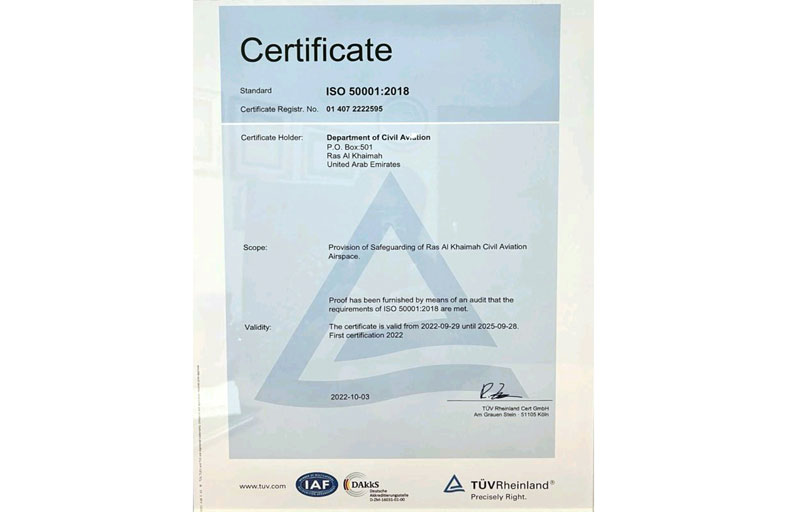 الطيران المدني برأس الخيمة يحصل على شهادة الأيزو في أنظمة إدارة الطاقة