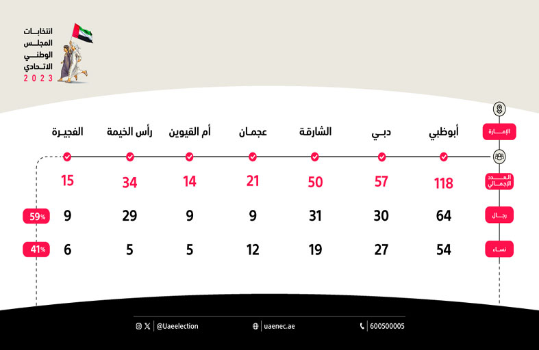 وتواصل المرأة الإماراتية مشاركاتها الفاعلة في مسيرة انتخابات المجلس الوطني الاتحادي خلال الدورة الانتخابية الخامسة؛ إذ ضمت القائمة الأولية للمرشحين (128) مرشحة بنسبة 41% من إجمالي عدد المرشحين، وتوزعن على الإمارات على النحو التالي: (54) في إمارة أبوظبي، و(27) في إمارة دبي، و(19) في إمارة الشارقة، و(12) في إمارة عجمان، و(5) في إمارة رأس الخيمة، و(5) في إمارة أم القيوين، و(6) في إمارة الفجيرة. ومن ثم؛ فقد ضمت القائمة الأولية للمرشحين (181) مرشحاً من الرجال بنسبة 59% من إجمالي عدد المرشحين، موزعين على الإمارات على النحو التالي: (64) في إمارة أبوظبي، و(30) في إمارة دبي، و(31) في إمارة الشارقة، و(9) في إمارة عجمان، و(29) في إمارة رأس الخيمة، و(9) في إمارة أم القيوين، و(9) في إمارة الفجيرة. وشهدت القائمة الأولية للمرشحين لعضوية المجلس الوطني الاتحادي 2023 في جميع إمارات الدولة، ترشح 36 من الشباب من الفئة العمرية من 25 إلى 35 عاماً بنسبة 11.65% من إجمالي عدد المرشحين.