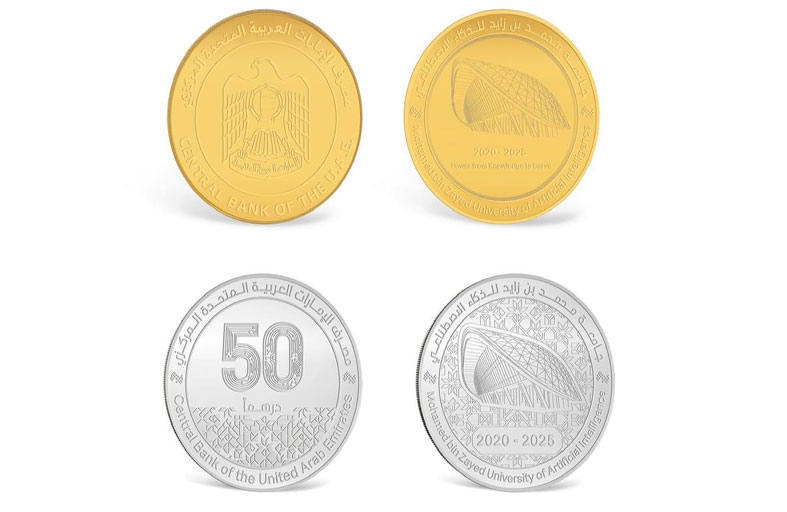 أصدر مصرف الإمارات العربية المتحدة المركزي، مسكوكاتٍ تذكارية من الذهب والفضة، احتفاءً بمرور خمس سنوات على تأسيس جامعة محمد بن زايد للذكاء الاصطناعي، واستقبالها الدفعة الأولى من طلبتها في عام 2020، وذلك تقديراً لما حققته من إنجازات بارزة خلال مسيرتها. ويُظهر الوجه الأمامي للمسكوكة الذهبية صورة لمبنى مركز المعرفة في الجامعة، إلى جانب العامين 2020 و 2025 للدلالة على مسيرة السنوات الخمس، كما يحمل التصميم عبارة " Power from Knowledge to Serve" باللغة الانجليزية الذي يعكس رسالة الجامعة ودورها المعرفي، محاطاً باسم "جامعة محمد بن زايد للذكاء الاصطناعي" باللغتين العربية والإنجليزية وشعار الجامعة. أما الوجه الخلفي، فيتضمن شعار دولة الإمارات، محاطاً باسم"مصرف الإمارات العربية المتحدة المركزي" باللغتين العربية والإنجليزية.