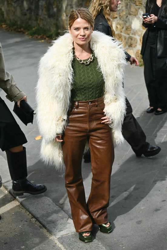 الممثلة الفرنسية ميلاني تييري تصل إلى عرض إبداعات رابان لمجموعة الملابس الجاهزة النسائية ضمن أسبوع الموضة في باريس. ا ف ب