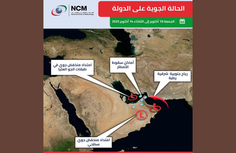 توقّع المركز الوطني للأرصاد أن تتأثر الدولة اعتباراً من يوم الجمعة المقبل وحتى الثلاثاء الـ14 من أكتوبر الجاري، بامتداد منخفض جوي سطحي من الجنوب، يتزامن مع منخفض جوي في طبقات الجو العليا مصحوب بكتلة هوائية باردة نسبياً ورطبة. ومن المنتظر أن تشهد البلاد خلال هذه الفترة سقوط أمطار تتراوح بين الخفيفة والمتوسطة، وتكون غزيرة أحياناً على فترات متباعدة، وذلك على مناطق متفرقة خاصة الشمالية والشرقية، وتمتد إلى بعض المناطق الداخلية والغربية، مع احتمال تساقط حبات برد صغيرة على مناطق محدودة. كما يُتوقع انخفاض درجات الحرارة، فيما تكون الرياح جنوبية شرقية إلى شمالية شرقية، تتحول لاحقاً إلى شمالية غربية، خفيفة إلى معتدلة السرعة، تنشط أحياناً لتصبح قوية، وقد تكون مثيرة للغبار والأتربة، بينما يكون البحر خفيفاً إلى متوسط الموج، وقد يضطرب أحياناً مع تكاثف السحب في الخليج العربي وبحر عمان.