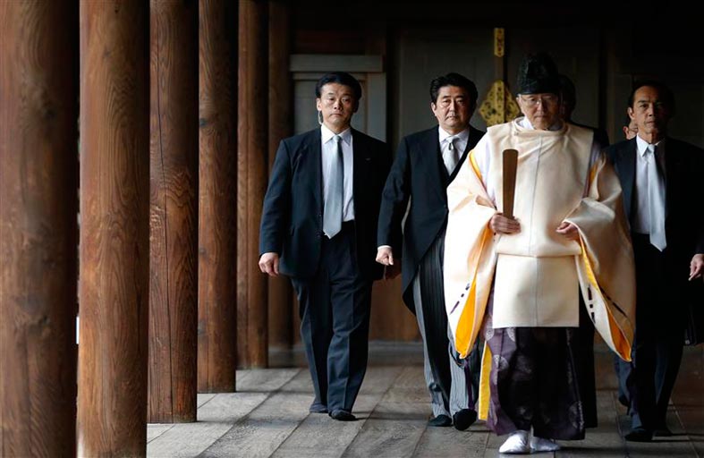 خلال خطابه أمام الكونجرس الأمريكي، اعترف شينزو آبي بعبارات متفاوتة في وضوحها بمسؤولية اليابان، ومباشرة إثر عودته، انتقد “التاريخ الماسوشي”. وهكذا كان آبي أول رئيس حكومة يمارس مهامه، وإن كان ذلك بصفته الشخصية -يمتلك اليمين الياباني إحساسًا بتلطيف الحدة -بزيارة حرم معبد ياسوكوني، وهو مكان مرتفع في طوكيو، حيث تُكرّم أرواح الجنود الذين سقطوا في ساحة المعركة، ومنهم الذين أُعدموا لارتكابهم جرائم حرب.