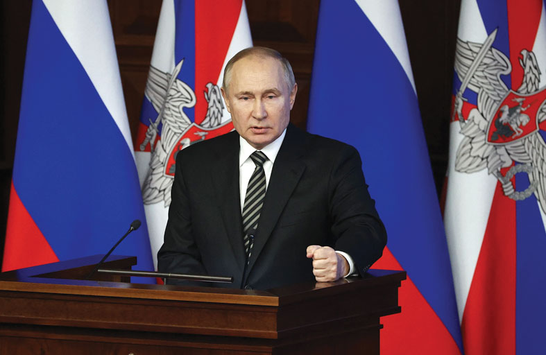 وقال الرئيس الروسي، متحدثا إلى كبار المسؤولين العسكريين، إن روسيا سترد بالشكل المناسب على أي اعتداء غربي وستواصل تطوير جيشها.