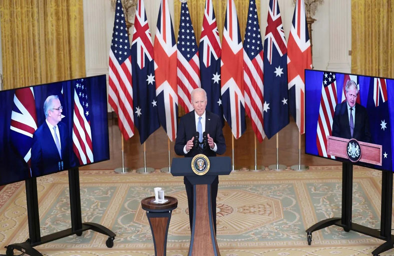 ووفق بيان مشترك الثلاثاء، قال الرئيس الأميركي جو بايدن ورئيس الوزراء البريطاني بوريس جونسون، ونظيره الأسترالي سكوت موريسون: "تعهدنا اليوم بالبدء في تعاون ثلاثي جديد بشأن الأسلحة الفرط صوتية وقدرات الحرب الإلكترونية، بالإضافة إلى توسيع مشاركة المعلومات وتعميق التعاون في الابتكار الدفاعي".