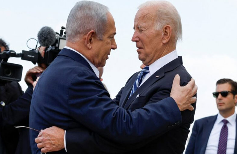 وناشد بايدن القول لإسرائيل: "نحن نغطي جناحكم عسكرياً بحاملتي طائراتنا، ومالياً بمساعدات بقيمة 14 مليار دولار، ودبلوماسيا في الأمم المتحدة. وثمن ذلك هو قبولكم بإطار سلام يُبنى على دولتين لشعبين أصليين في غزة والضفة الغربية وإسرائيل ما قبل 1967".