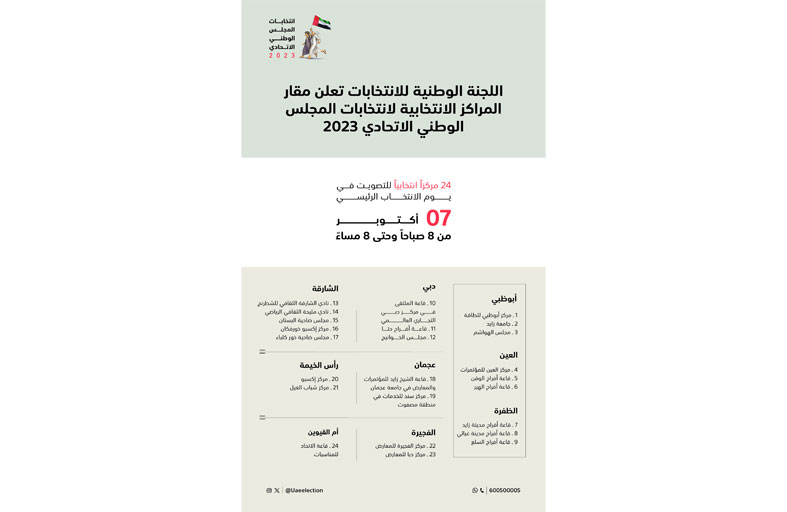 يشار إلى أن آلية التصويت في يومي التصويت المبكر 4 و5 أكتوبر ستكون من خلال نظام التصويت الهجين (التصويت إلكترونياً في 9 مراكز انتخابية، وعن بُعد عبر تطبيق (شارك للإمارات)، ورابط التصويت في التطبيق الذكي للجنة الوطنية للانتخابات وموقعها الإلكتروني uaenec.ae، على أن يُخصص يوم 6 أكتوبر للتصويت عن بُعد فقط، كما سيكون يوم 7 أكتوبر يوم الانتخاب الرئيسي عبر التصويت الإلكتروني في 24 مركزاً انتخابياً، أو “التصويت عن بُعد” .وتتوافر معلومات شاملة عن انتخابات المجلس الوطني الاتحادي 2023 عبر الموقع الإلكتروني للجنة الوطنية للانتخابات www.uaenec.ae، وتطبيقها الذكي (اللجنة الوطنية للانتخابات- UAENEC) المتوفر على متجري آبل ستور وجوجل بلاي، وصفحات التواصل الاجتماعي الخاصة باللجنة، أو عبر خدمة الواتساب على الرقم (600500005).