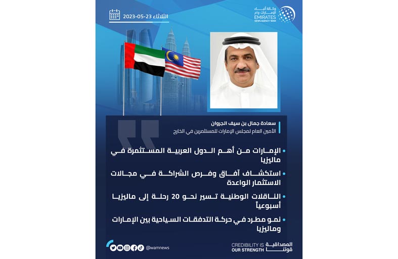 ولفت إلى أن دولة الإمارات تولي اهتمامًا كبيرًا للتعاون الاقتصادي والاستثماري مع ماليزيا التي تعدّ واحدة من الدول ذات الثقل الاقتصادي الرئيسي في منطقة جنوب شرق آسيا وخصوصا في قطاعات الابتكار والتكنولوجيا الحديثة وتطبيقات الثورة الصناعية الرابعة والاقتصاد الرقمي والطاقة المتجددة والصناعة والرعاية الصحية. وقال الجروان إن العلاقات الثنائية بين دولة الإمارات ومملكة ماليزيا تشهد تطورا مستمرا بدعم من قيادتي البلدين الصديقين، وهو ما تعكسه العديد من المؤشرات الإيجابية للتعاون المشترك على كافة الأصعدة، متوقّعا أن يتقاسم البلدان تجاربهما التنموية الجديرة بالاهتمام والدراسة، في ظل ما حققه اقتصاد كل منهما من إنجازات كبيرة ونهضة تنموية يعززها انفتاح اقتصادي حر ومتنوع.