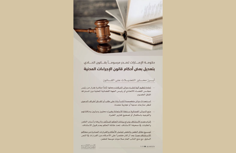 أصدرت حكومة الإمارات مرسوماً بقانون اتحادي، يقضي بتعديل عدد من أحكام قانون الإجراءات المدنية، في خطوة متقدمة تهدف إلى تطوير البنية الإجرائية للقضاء المدني، وتعزيز كفاءة مراحل التقاضي، وتحسين جودة العمل القضائي بما يلبي احتياجات العدالة المعاصرة.