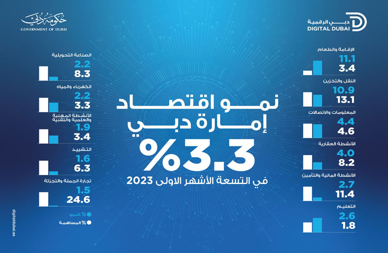 واستحداث مقومات جذب جديدة وفرص مستدامة للاستثمار.. وتوثيق شراكاتنا القائمة وبناء المزيد منها في مسيرة هدفها تعزيز المكانة الرائدة لدبي لتكون ضمن أفضل ثلاث مدن اقتصادية في العالم خلال العقد المقبل .ويأتي نمو اقتصاد دبي العام مدفوعاً بالارتفاع الملحوظ الذي حققته العديد من قطاعاتها ومنها قطاع خدمات الإقامة والطعام، الذي حقق نمواً نسبته 11.1 في المائة، وقطاع خدمات النقل والتخزين الذي نما بنسبة 10.9 في المائة، وقطاع المعلومات والاتصالات الذي وصلت نسبة نموه 4.4 في المائة وغيرها من القطاعات والأنشطة الأخرى.وبحسب البيانات الصادرة عن مؤسسة دبي للبيانات والإحصاء بهيئة دبي الرقمية، فإن أداء اقتصاد دبي شهد نمواً في العديد من القطاعات والمجالات والتي من بينها الأنشطة العقارية بنسبة 4في المائة، والأنشطة المالية وأنشطة التأمين بنسبة 2.7 في المائة، وأنشطة التعليم بنسبة 2.6 في المائة، وخدمات الكهرباء والغاز والمياه وأنشطة إدارة النفايات بنسبة 2.2 في المائة، إضافة إلى الصناعات التحويلية بنسبة 2.2 في المائة، والأنشطة المهنية والعلمية والتقنية بنسبة 1.9 في المائة.