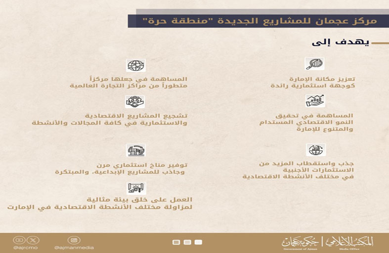 وبموجب المرسوم الأميري رقم (15) لسنة 2023، يُنشأ في إمارة عجمان منطقة حرة تسمى "مركز عجمان للمشاريع الجديدة" تتبع حكومة الإمارة، وتتمتع بالشخصية الاعتبارية وبالاستقلال المالي والإداري وتكون لها الأهلية القانونية اللازمة لتحقيق أهدافها وممارسة مهامها وصلاحياتها المنوطة بها بموجب أحكام هذا المرسوم. وحدد المرسوم، أهداف المركز المتمثلة في تعزيز مكانة الإمارة كوجهة استثمارية رائدة، والمساهمة في جعلها مركزاً متطوراً من مراكز التجارة العالمية، والمساهمة في تحقيق النمو الاقتصادي المستدام والمتنوع للإمارة من خلال تشجيع المشاريع الاقتصادية والاستثمارية في كافة المجالات والأنشطة، وجذب واستقطاب المزيد من الاستثمارات الأجنبية في مختلف الأنشطة الاقتصادية، وتوفير مناخ استثماري مرن وجاذب للمشاريع الإبداعية، والمبتكرة، والعمل على خلق بيئة مثالية لمزاولة مختلف الأنشطة الاقتصادية في الإمارة للمساهمة في تنمية وتطوير الاقتصاد ودعم القدرة التنافسية للإمارة، وتشجيع إنشاء الصناعات القائمة على مصادر الطاقة البديلة والمتجددة بغرض المحافظة على الموارد الطبيعية وتحسين الصحة العامة والبيئة، وتحقيق الكفاءة في السياسات والعمليات للمنشآت المرخصة في المركز.