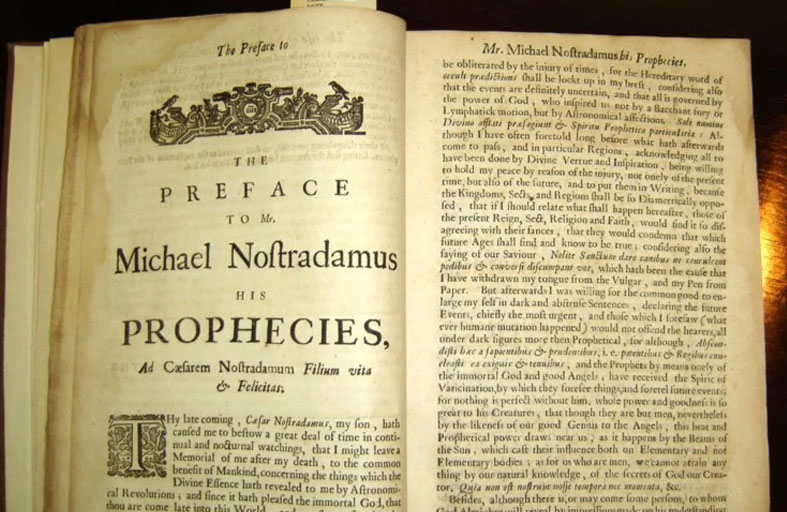 يذكر أن كتاب نوستراداموس الشهير الذي نشر عام 1555 يحتوي على 942 تنبؤاً مكتوباً بمزيج من العبارات اللاتينية الغامضة والفرنسية القديمة، ويؤمن أتباعه بأنه تنبأ بأحداث عالمية كبرى بحسب تأويلاتهم للنصوص.