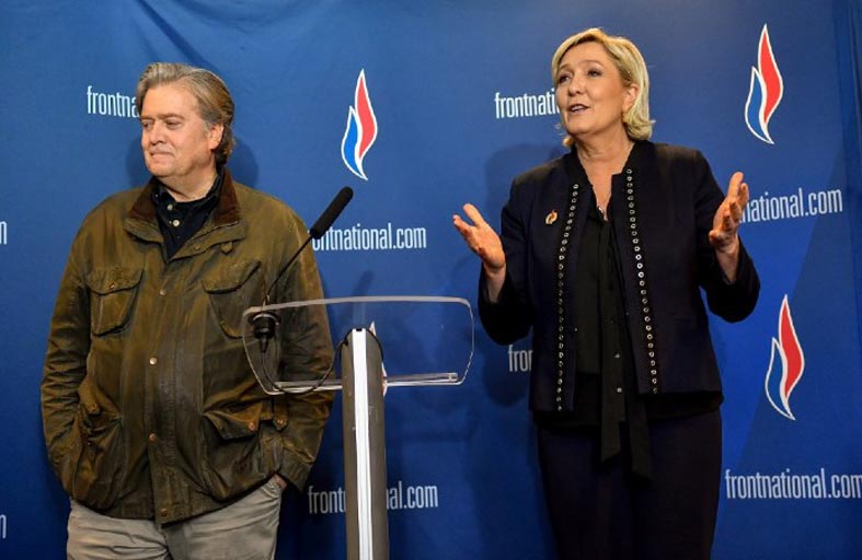 بعد مناظرتها الفاشلة مع إيمانويل ماكرون عام 2017، اختفت، لتضمّد جراحها، وتعدّ مؤتمر حزبها، وعودتها إلى الاضواء. لقد عرفت كيف تُنسي نفسها، لتظهر بشكل أفضل وبجانبها، المستشار السابق لدونالد ترامب، ستيف بانون، الشرير الرائع، الذي صرح لمناضلي الجبهة الوطنية المجتمعين في ليل: "دعوهم يصفونكم بالعنصرية، وكره الأجانب، ورهاب الإسلام ... ارتدوا ذلك كوسام شرف، لأننا نزداد قوة مع كل يوم يمر، وهم يضعفون".