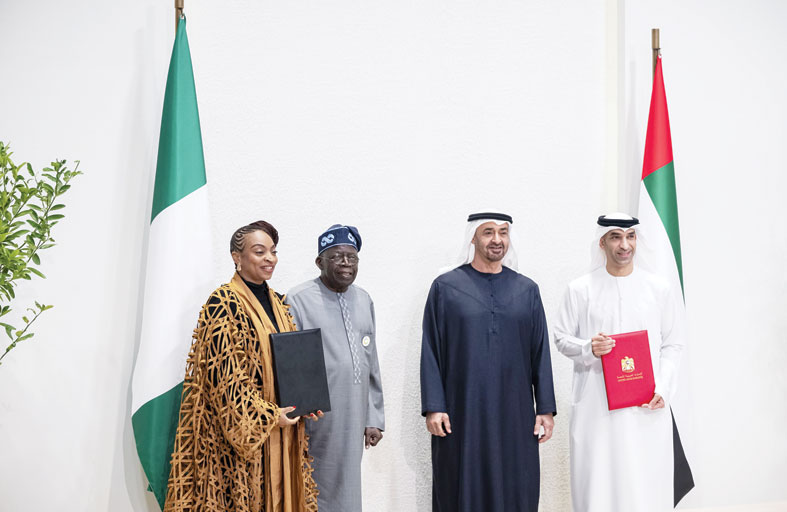 شهد صاحب السمو الشيخ محمد بن زايد آل نهيان، رئيس الدولة "حفظه الله"، وفخامة بولا أحمد تينوبو، رئيس جمهورية نيجيريا الاتحادية، مراسم توقيع اتفاقية الشراكة الاقتصادية الشاملة بين دولة الإمارات ونيجيريا، والتي تهدف إلى تدشين مرحلة جديدة من العلاقات التجارية والاستثمارية المزدهرة بين البلدين في إطار سعيهما إلى تحقيق التنمية المستدامة.