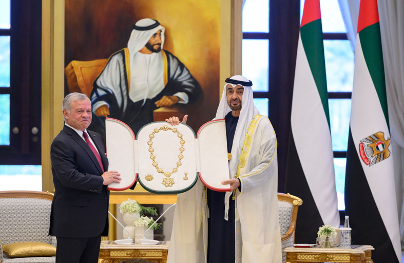 منح صاحب السمو الشيخ محمد بن زايد آل نهيان رئيس الدولة "حفظه الله"، صاحب الجلالة الملك عبدالله الثاني بن الحسين عاهل المملكة الأردنية الهاشمية الشقيقة، "وسام زايد"، الذي يعد أعلى وسام تمنحه دولة الإمارات إلى قادة الدول وملوكها ورؤسائها، وذلك تقديراً للجهود التي بذلها جلالته في تعزيز العلاقات الأخوية الراسخة والتعاون المشترك بين البلدين والإسهام في ازدهار هذه العلاقات على جميع المستويات.