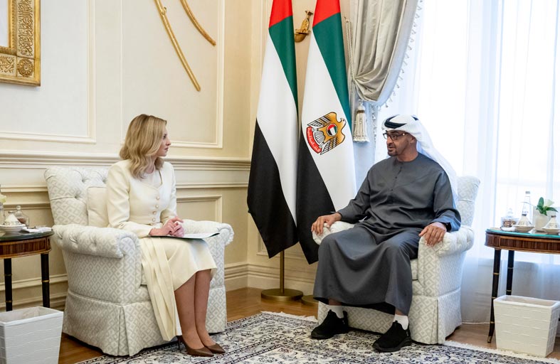 استقبل صاحب السمو الشيخ محمد بن زايد آل نهيان رئيس الدولة (حفظه الله)، السيدة الأولى أولينا زيلينسكا حرم الرئيس الأوكراني فولودومير زيلينسكي، رئيسة مؤسسة أولينا زيلينسكا للمنظمات الخيرية التي تقوم بزيارة إلى الدولة للمشاركة في النسخة الثانية من (قمة فوربس 50/30) التي تستضيفها أبوظبي خلال الفترة من 7 إلى 10 من شهر مارس الجاري.