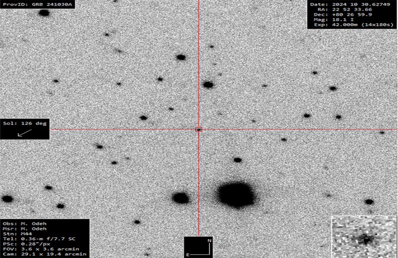 وقال إن هذه الظاهرة ناتجة عن انفجار نجم كبير أيضا وتبين من خلال عمليات الرصد التالية أنه يبعد عنا 9 مليارات سنة ضوئية، وقام مرصد الختم برصد هذا الهدف لفترة طويلة أمكن من خلالها رسم المنحنى الضوئي لتغير لمعان الجرم.وفي ظاهرة لا تتكرر كثيرا، حدث في اليوم نفسه الساعة 18:34 مساء بتوقيت غرينتش انفجار ثالث أعطي الرقم (GRB 241030B) ونظرا لحدوثه مساء بتوقيت الإمارات فقد تم توجيه تلسكوب المرصد مباشرة نحو الهدف وذلك بعد 24 دقيقة فقط من توهج أشعة "غاما" (GRB) وبعد تصوير استمر لمدة 21 دقيقة، تبين وجود جرم جديد يلمع بالقدر 18.9.