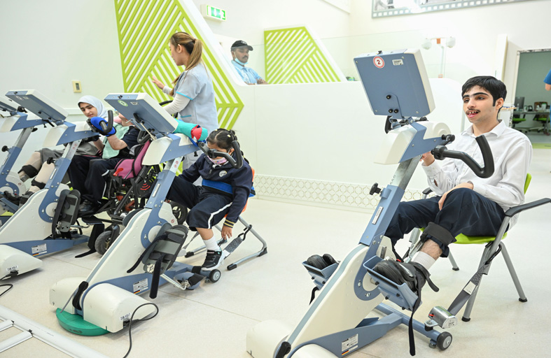 كما يضم المختبر العلاج الجماعي للأطفال المتصل مع ربط أربعة أجهزة بشاشة رئيسية يتيح للأطفال التنافس فيما بينهم عبر الألعاب الجماعية والجهاز مخصص لعلاج الإعاقات الحركية السفلية والعلوية، كما يشمل المختبر أجهزة تستخدم الذكاء الاصطناعي في تأهيل الحركة العلوية والسفلية والتي تقوم بتقييم حالة المريض للمساعدة في وضع خطة علاجية مناسبة لكل مريض مع تخزين البيانات والمؤشرات الخاصة بكل مريض.