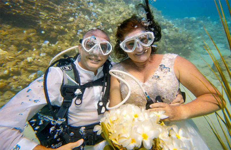 في تجربة زفاف غير تقليدية، اختار الزوجان سيبيل بلومنتال وروب بورفيلد، وكلاهما في الخامسة والخمسين من العمر، أن يربطا حياتهما تحت سطح البحر في حفل أُقيم في كاب مالوريو شمال موريشيوس، وسط أجواء مستوحاة من شغفهما المشترك بالغوص. وجاء قرار الزواج تحت الماء بعد علاقة امتدت 12 عامًا من ممارسة الغوص معًا، حيث أكدت سيبيل أن المحيط يمثل لهما "ملاذًا سعيدًا"، مشيرة إلى أن هذه البيئة كانت الخيار الأكثر تعبيرًا عن علاقتهما. والتقى الزوجان عبر صديق مشترك، وسرعان ما تحولت هوايتهما إلى علاقة عاطفية دفعت بهما إلى الانتقال من أوروبا إلى بالي قبل ثلاث سنوات لممارسة الغوص بشكل يومي تقريبًا. وقبل الزفاف، أتم العروسان الإجراءات الرسمية على متن قارب، ثم انتقلا إلى موقع الغوص حيث أقيـم حفل بسيط على قاع رملي مزين بقوس من سعف النخيل والزهور البيضاء، إلى جانب عناصر احتفالية استوائية.