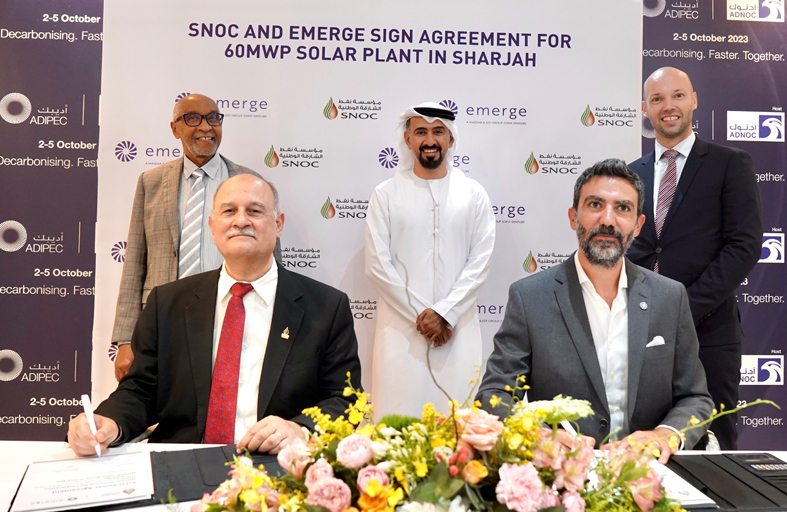 جاء ذلك بمناسبة توقيع مؤسسة نفط الشارقة الوطنية (سنوك) الذراع التنفيذي لصناعة النفط والغاز في إمارة الشارقة، اتفاقية إنشاء أكبر محطة للطاقة الشمسية في الشارقة، مع شركة إيميرج المملوكة لكل من شركة أبوظبي لطاقة المستقبل (مصدر) وشركة الكهرباء الفرنسية(EDF)، وذلك على هامش أعمال معرض ومؤتمر أبو ظبي الدولي للبترول (أديبك).