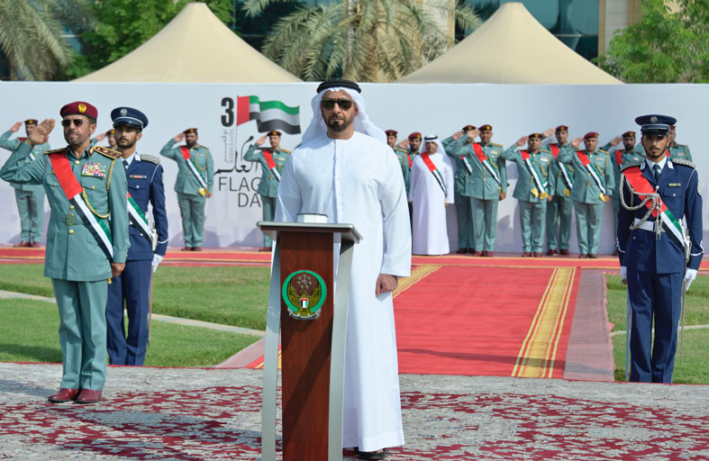 سيف بن زايد يرفع علم الدولة على سارية مبنى الداخلية