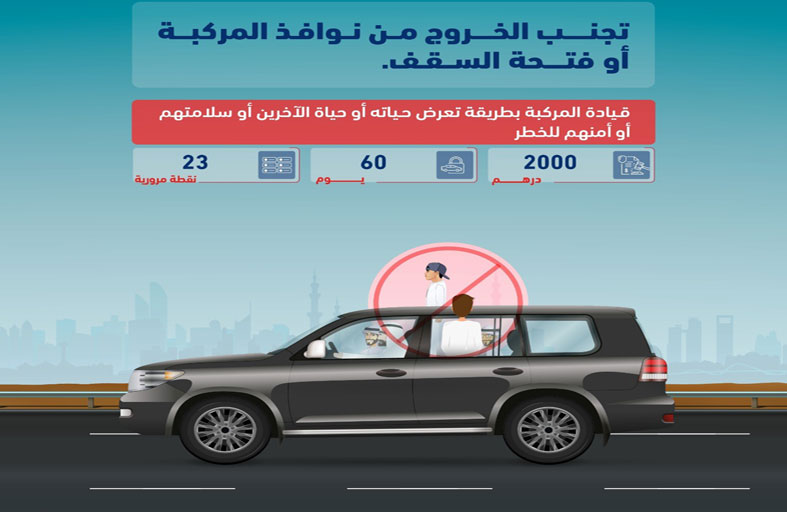 دعت مديرية المرور والدوريات الأمنية في شرطة أبوظبي سائقي المركبات إلى ضرورة الالتزام بقواعد السير والمرور وتعليمات رجال الشرطة، وعدم السماح لمرافقيهم بالخروج من نوافذ المركبة ، وحذرت من خطورة قيادة بعض السائقين المستهترين للمركبة بطريقة تعرض حياتهم أو حياة الآخرين أو سلامتهم للخطر.  وحثت السائقين على ضرورة الالتزام بسلامة مرافقيهم في جميع الأوقات موضحة أن التصرفات الغير المسؤولة تؤثر سلباً على حياة الاخرين وتعرضهم لحوادث مرورية مؤلمة قد تؤدي الى الوفاة والإصابات البليغة الخطرة. وأوضحت أن البند رقم “1” من مخالفات التعريض للخطر وفق القرار الوزاري رقم (178) لعام 2017 بشأن قواعد وإجراءات الضبط المروري تنص على التالي: قيادة مركبة بطريقة تعرض حياته أو حياة الآخرين أو سلامتهم أو أمنهم للخطر فإن الغرامة المترتبة هي 2000 درهم و(23) نقطة مرورية وحجز المركبة لمدة (60) يوماً