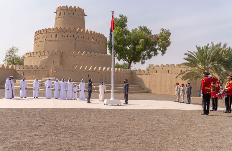 طحنون بن محمد يرفع العلم في قلعة الجاهلي بمدينة العين