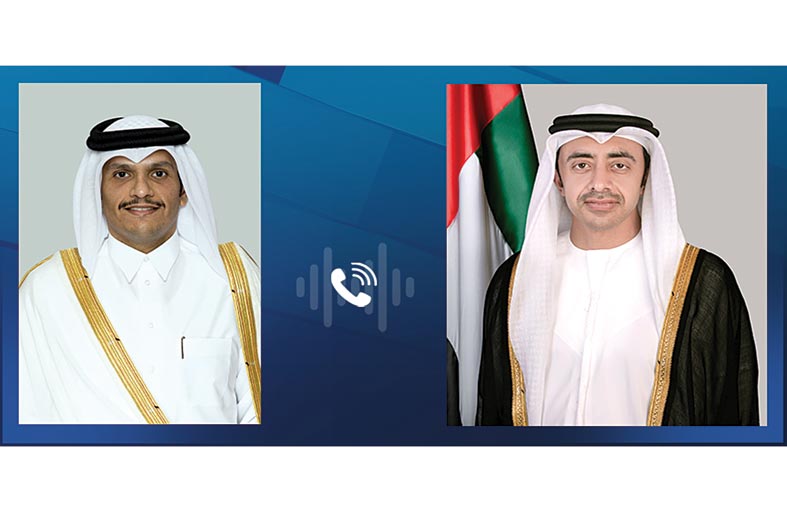 تبادل سمو الشيخ عبدالله بن زايد آل نهيان وزير الخارجية ، ومعالي الشيخ محمد بن عبد الرحمن بن جاسم آل ثاني رئيس مجلس الوزراء وزير خارجية دولة قطر الشقيقة ، هاتفيا التهنئة بمناسبة استئناف سفارة دولة قطر في أبوظبي وقنصليتها في دبي وسفارة دولة الإمارات في الدوحة مزاولة أعمالها أمس الإثنين.