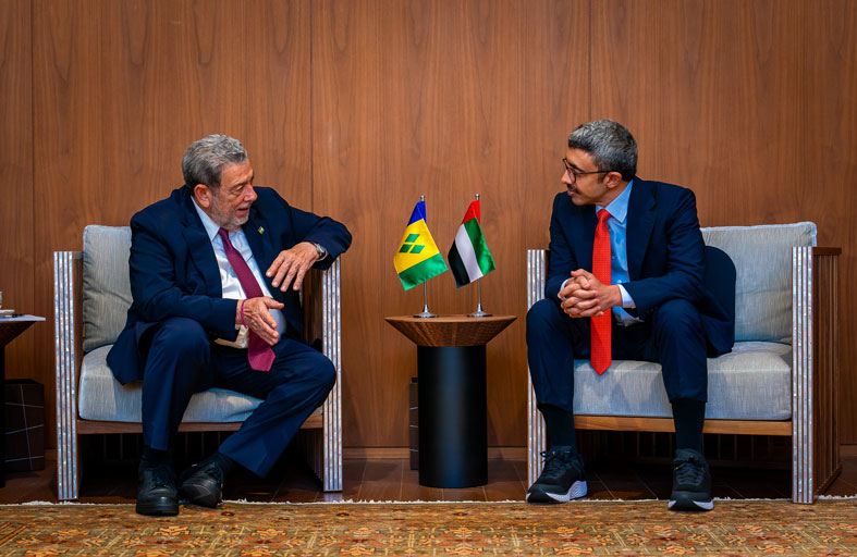 التقى سمو الشيخ عبدالله بن زايد آل نهيان وزير الخارجية، معالي رالف جونسالفيس رئيس وزراء سانت فنسنت وغرينادين. وبحث الجانبان خلال اللقاء، الذي عقد على هامش أعمال الجمعية العامة للأمم المتحدة في نيويورك ، التعاون الثنائي في عدة مجالات ومنها التنموية والطاقة المتجددة. كما استعرضا القضايا المدرجة على جدول أعمال الدورة الـ 78 من الجمعية العامة للأمم المتحدة، ومنها التغير المناخي والتنمية المستدامة.