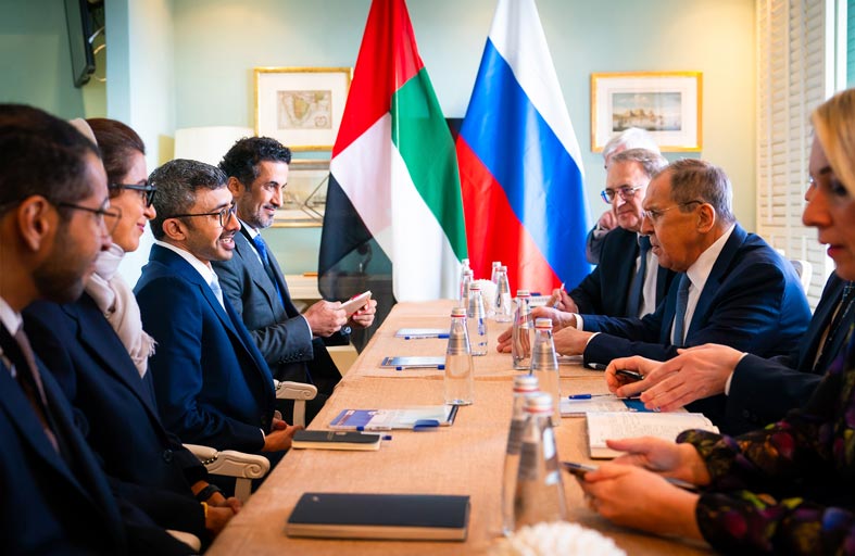 التقى سمو الشيخ عبدالله بن زايد آل نهيان وزير الخارجية معالي سيرجي لافروف وزير خارجية روسيا الاتحادية ، وذلك على هامش اجتماع "أصدقاء بريكس" في كيب تاون بجنوب أفريقيا. جرى خلال اللقاء بحث علاقات الصداقة، والشراكة الاستراتيجية بين دولة الإمارات وروسيا الاتحادية ، وسبل تعميقها في المجالات كافة. كما استعرض سموه ومعالي وزير الخارجية الروسي عددا من الملفات المرتبطة بجدول أعمال الاجتماع ، وبحثا المستجدات على الساحتين الإقليمية والدولية وتبادلا وجهات النظر بشأنها. وأكد سمو الشيخ عبدالله بن زايد آل نهيان خلال اللقاء أن العلاقات الإماراتية الروسية تستند إلى أسس راسخة من التفاهم والاحترام المتبادل والتعاون المثمر والبنّاء، وتشهد نموا متسارعا خاصة بعد التوقيع على الشراكة الاستراتيجية بين البلدين عام 2018. وأشار سموه إلى حرص البلدين الصديقين على تطوير هذه العلاقات ودفع آفاق التعاون المشترك في المجالات كافة بما يعود بالنفع على شعبيهما ويحقق مصالحهما المتبادلة. وأعرب سموه عن تطلع دولة الإمارات إلى تعزيز التعاون مع دول مجموعة "بريكس" ودعم العمل متعدد الأطراف الهادف إلى تحقيق التنمية في كافة المجتمعات وحفظ السلم والأمن الدوليين وترسيخ مستقبل مزدهر للأجيال القادمة.