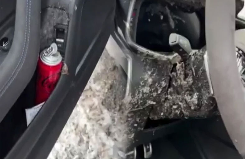 وأظهرت اللقطات أن آثار الانفجار امتدت إلى معظم أجزاء السيارة من الداخل، حيث تلطخت المقاعد، والكونسول الأمامي، ولوحة القيادة، والعدادات ببقايا المشروب، مع ظهور تلف واضح في بعض أجزاء التنجيد، ما يرجّح تكبد مالك السيارة خسائر مادية قد تتطلب أعمال تنظيف وإصلاح مكلفة.
