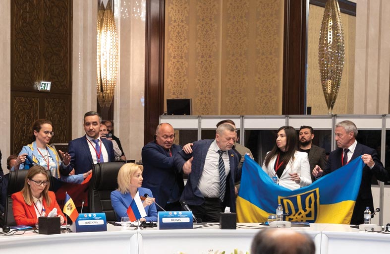 وفي وقت سابق من أمس، تشاجر بعض المندوبين الأوكرانيين مع أفراد الأمن عندما حاولوا سحبهم بعيدا بينما كانوا ينظمون احتجاجا ويصيحون ويرفعون أعلامهم بجوار المندوبة الرئيسية لروسيا أثناء محاولتها مخاطبة الاجتماع.