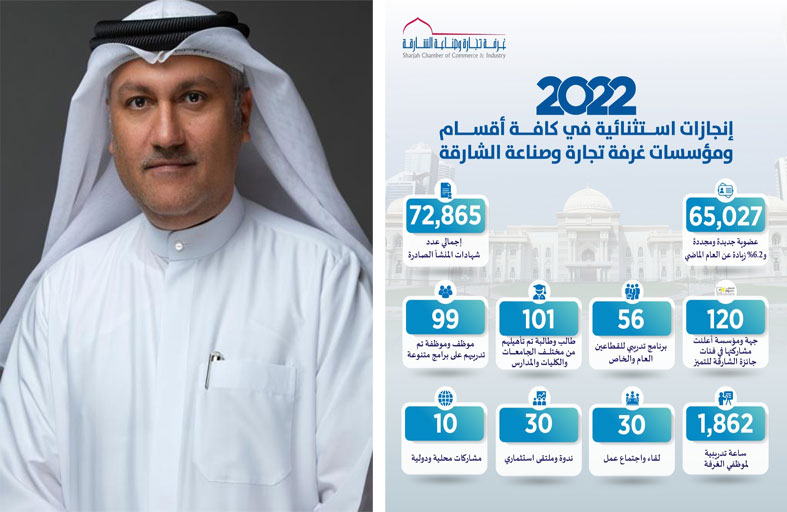 واصلت غرفة تجارة وصناعة الشارقة خلال العام الماضي دورها الريادي في تهيئة أفضل بيئة استثمارية عززت من مكانة إمارة الشارقة على خريطة الأعمال العالمية والارتقاء بإمكاناتها الاقتصادية والتنافسية من خلال إستراتيجية الغرفة وتوجهاتها القائمة على حماية مصالح رجال الأعمال وترسيخ دورها في دعم أعضائها من القطاع الخاص إلى جانب المساهمة في نمو قطاعات الاقتصاد محليا وتعزيز صادرات وإعادة صادرات أعضائها وتشجيع الاستثمار وتسهيل نموه بما يواكب توجهات حكومة الشارقة وخططها القائمة على الابتكار والاستدامة. وتمثلت الإنجازات النوعية والاستثنائية التي حققتها غرفة الشارقة خلال العام 2022 في حجم النمو المحقق بعدد العضويات المنضوية تحت مظلتها مسجلة 6.2% زيادة عن العام الماضي بـ 65027 عضوية جديدة ومجددة ونحو 2% ارتفاعا في إجمالي عدد شهادات المنشأ الصادرة وصلت إلى 72865 شهادة.